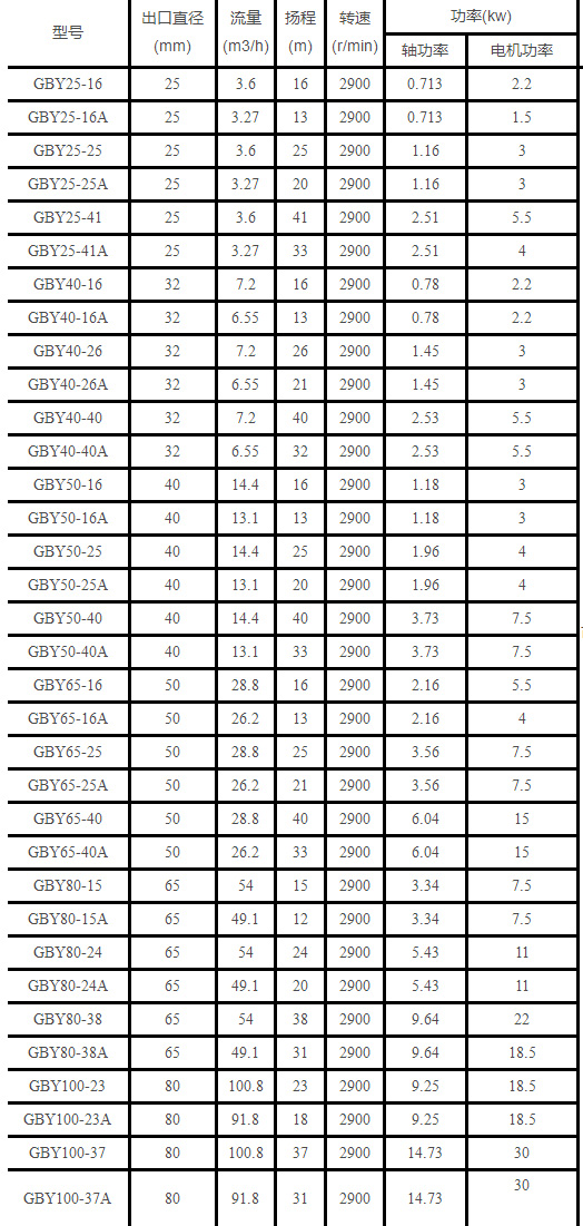 GBY濃(nong)硫酸液下泵性(xìng)能參數表
